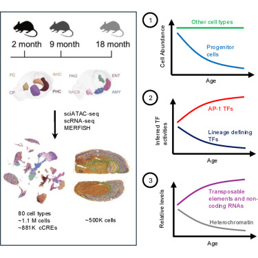 大脑衰老过程中转录调控机制的阐明仍不甚明了。本研究利用单细胞表观基因组学技术,分析了 2、9 和 18 月龄小鼠大脑八个区域的染色质可及性和基因表达谱。结果显示,除了参与神经发生和髓鞘形成的前体细胞数量显著减少外,神经元和胶质细胞的转录和染色质可及性均出现广泛且一致的年龄相关性变化。这些变化伴随着关键转录因子的失调以及由激活蛋白 1 (AP-1) 驱动的应激反应程序的转变,表明细胞身份随年龄增长而逐渐发生漂移。此外,我们还发现区域和细胞类型特异性的异染色质丢失,其特征是 H3K9me3 标记区域的可及性增加、转座元件的激活以及长链非编码 RNA 的上调,尤其是在谷氨酸能神经元中。这些发现共同揭示了与年龄相关的异染色质维持和转录调控的破坏,突显了大脑衰老过程中脆弱的脑区、细胞类型和分子通路。