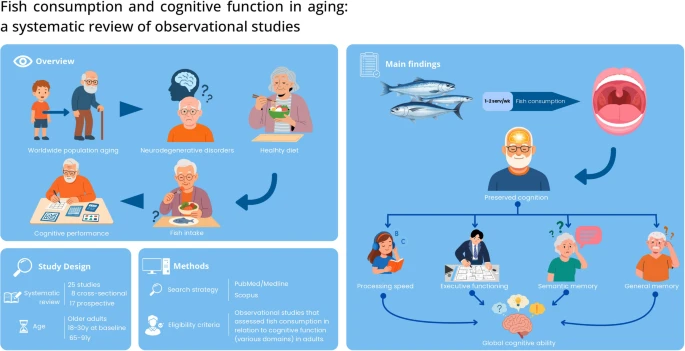 本研究旨在系统回顾现有观察性研究,探讨鱼类摄入量与老年人认知功能之间的关联。共纳入25项研究(8项横断面研究和17项前瞻性研究,主要纳入健康老年人,前瞻性研究的基线年龄范围为18至30岁,而前瞻性研究的基线年龄范围为65至91岁,代表了年龄范围的上限)。目前大多数已发表的研究探讨的认知功能涵盖多个领域,例如整体认知、记忆(情景记忆、工作记忆)、执行功能(计划、抑制、灵活性)、注意力和处理速度。现有研究在设计(横断面研究和前瞻性研究)、地理区域、参与者人数以及用于评估相关结果的工具方面差异很大。