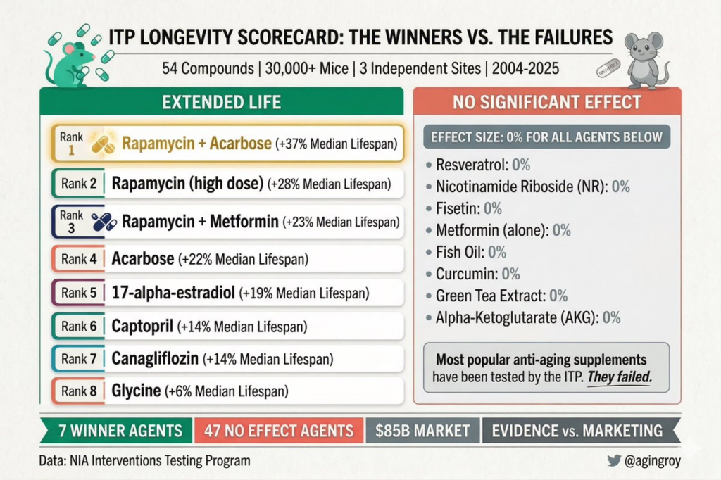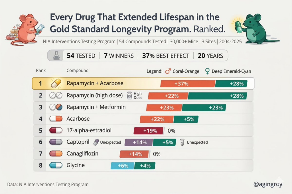 这是ITP历史上记录到的最强效果。雷帕霉素负责关闭促老化的“生长开关”(mTOR),阿卡波糖负责减缓糖分吸收。两者双管齐下,就像癌症治疗中的“联合用药”一样,从两个维度同时打击老化。