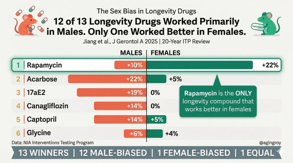在证明有效的药物中,有12种对雄性效果更好,只有雷帕霉素是女性获益更多。 这不是偶然,而是生物学差异。这意味着,如果一个长寿方案不考虑性别差异,那基本就是在“盲开”。