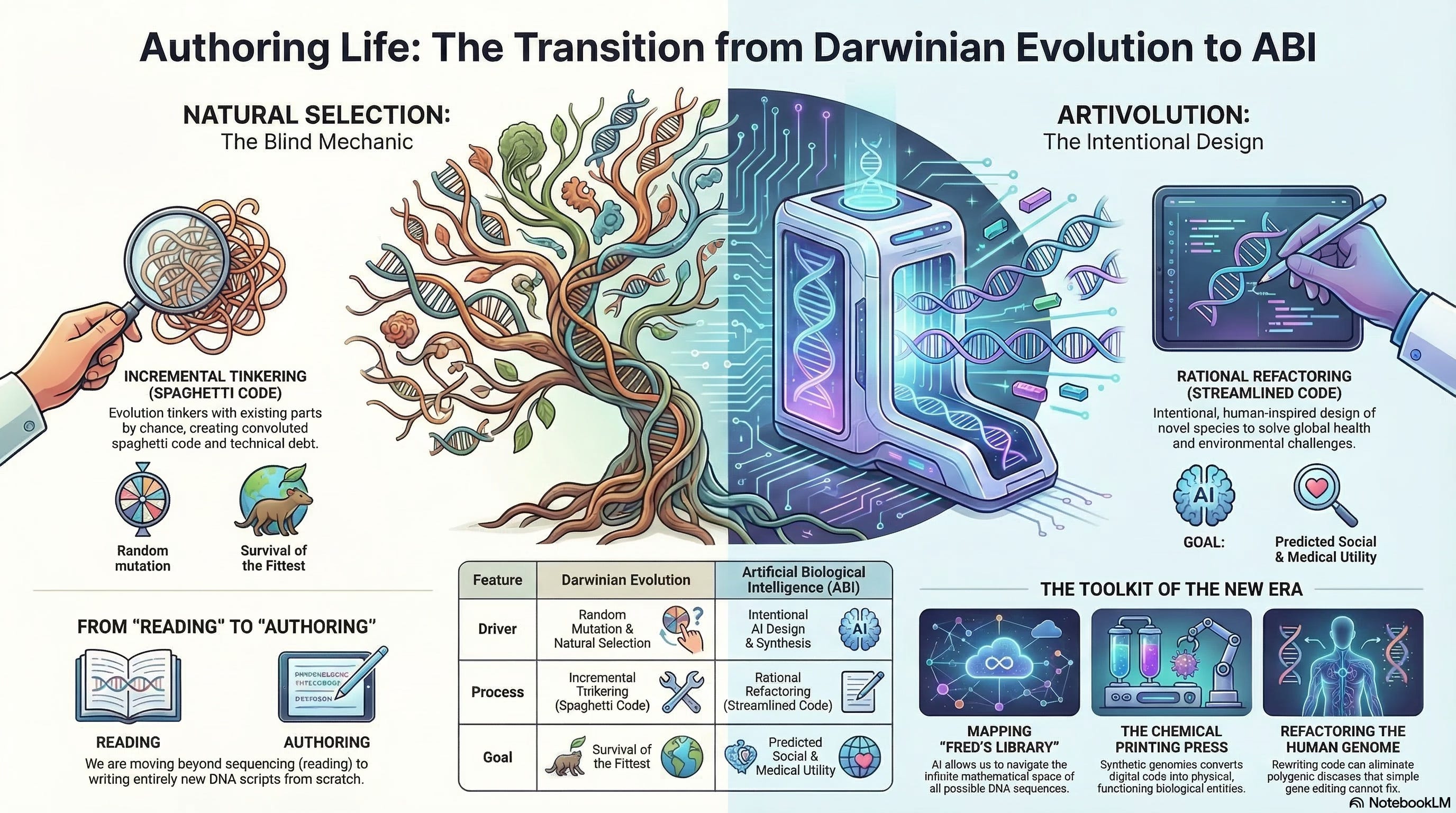 ABI。正如阿德里安所说,这是一次巨大的转变,第二次起源,“人工进化”,能够使用分子古腾堡印刷机,这是后达尔文时代。我制作了一张关于这本书以及我们与 NotebookLM 对话的信息图。