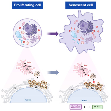 脂质作为空间调控的信号分子发挥作用。它们的生物活性不仅取决于其丰度,还取决于其亚细胞定位。神经酰胺便是这一原理的典型例证:线粒体神经酰胺的积累会促进细胞凋亡,然而神经酰胺区室化如何调控其他细胞命运程序仍不清楚。本文中,我们证实复制性衰老不仅由神经酰胺水平升高所定义,还由神经酰胺转运紊乱所定义,后者驱动神经酰胺在内质网(ER)的积累。我们发现,通过CERT介导的ER到高尔基体的神经酰胺转运受损是衰老相关鞘脂重塑的关键调控节点。在功能上,干扰神经酰胺转运会模拟衰老的脂质和表型特征,揭示了脂质转运是决定细胞命运的关键因素。通过将内质网定位的神经酰胺积累与内质网应激信号联系起来,这项工作揭示了脂质空间组织与衰老程序之间的联系,突出了细胞器解析的脂质代谢作为衰老生物学中一个可靶向的轴。