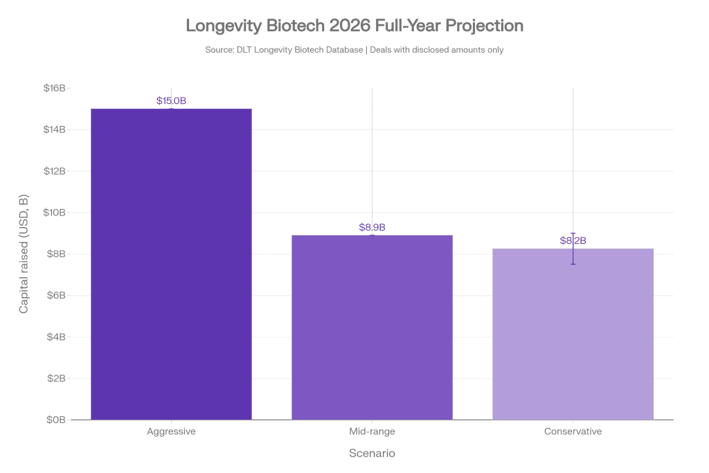 以 2026 年第一季度为基准,DLT 聊天机器人构建了 2026 年全年长寿生物技术融资的三种预测方案。