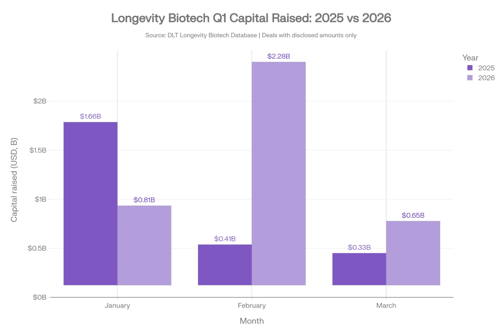 从2026年1月1日至3月30日,DLT记录了长寿生物技术领域的49起融资事件,其中41起已披露交易规模,总融资额约为37.4亿美元。这使得2026年第一季度成为迄今为止该数据集中最活跃的季度之一。