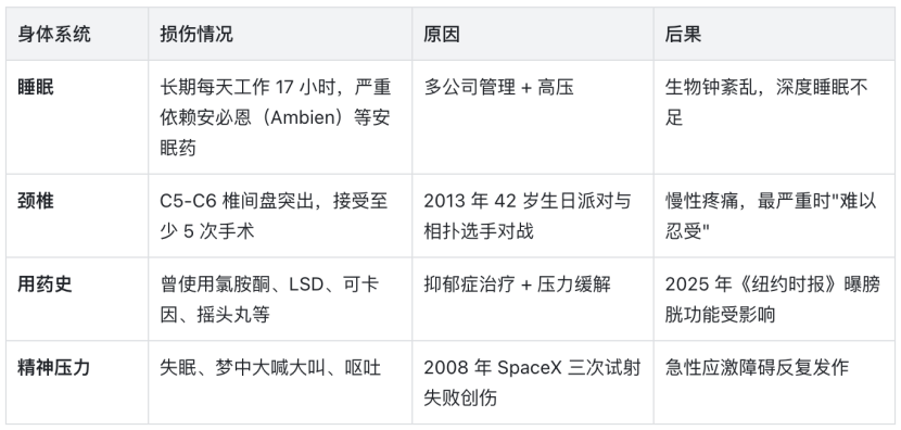 为什么马斯克这么需要抗衰技术?答案很简单:他的身体,已经快被他造废了。根据公开报道和传记作家沃尔特·艾萨克森的披露,我们可以列出一份触目惊心的”马斯克身体损伤清单”: