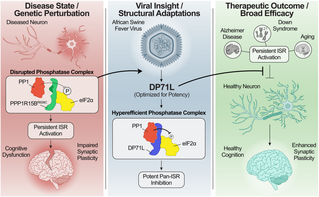 我们对一种与疾病相关的 PPP1R15B 变体的研究促使我们进一步研究其进化相关的、高度优化的病毒对应物 DP71L,一种由非洲猪瘟病毒编码的小蛋白。DP71L 仅由 PP1 和 eIF2 结合基序组成,是能够抑制 ISR 的磷酸酶辅因子家族中最小的成员。突变、结构和功能分析揭示了 DP71L 作为强效泛 ISR 抑制剂的分子机制。值得注意的是,在唐氏综合征、阿尔茨海默病和衰老的小鼠模型中,DP71L 治疗逆转了认知和突触功能障碍,这些疾病的特征都是 ISR 持续激活。最后,我们还发现 DP71L 足以增强健康小鼠的长期记忆和突触可塑性,凸显了其治疗潜力。