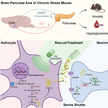 慢性压力(CS)会加剧焦虑和高血糖,并已成为2型糖尿病的关键危险因素,但其机制尚不明确。本研究发现,CS可诱导小鼠高血糖并加速杏仁核星形胶质细胞衰老。杏仁核星形胶质细胞衰老是由前B细胞白血病同源框转录因子1(PBX1)驱动的己糖激酶2(HK2)表达降低所介导的。星形胶质细胞Hk2基因敲除小鼠和杏仁核特异性星形胶质细胞Hk2基因敲低小鼠均表现出焦虑样行为和高血糖。星形胶质细胞中HK2表达降低会减少L-丝氨酸的合成,并通过破坏星形胶质细胞-神经元丝氨酸穿梭系统,减少神经元生成D-丝氨酸所需的丝氨酸供应。杏仁核神经元中D-丝氨酸水平降低会破坏杏仁核-胰腺交感神经和副交感神经投射的平衡,从而导致高血糖。补充L-丝氨酸或使用达沙替尼/槲皮素清除衰老细胞可缓解香烟烟雾诱导的神经行为异常和外周高血糖。综上所述,这些发现表明杏仁核星形胶质细胞中的HK2介导了香烟烟雾诱导的神经行为异常和高血糖。